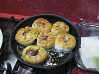 Разогреваем сковороду. У меня с толстым дном. Наливаем половину масла и выкладываем беляши сначала верхней стороной в масло. |