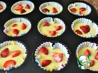 Вылить по 1,5 ч. л. теста в формочки для кексов, выложить в каждую по 3-4 кусочка клубники. |