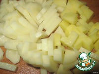 | Картофель очистить,нарезать кубиками,добавить в бульон. |