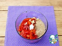 Добавляем печеный перец, панировочные сухари, чеснок, зиру, паприку, бальзамик, лимонный сок и оливковое масло. |