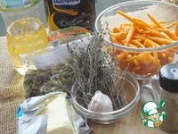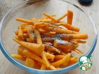 Подготовленную морковь посыпаем солью, перцем и тимьяном. Перемешиваем. |