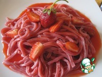 Описание: Любите домашнюю лапшу? Предлагаю приготовить лапшу не на первое или второе блюдо, а на десерт. Лапша приготовлена на основе пюре клубники и подается с горячим клубничным сиропом, но также этот десерт очень вкусен и в холодном виде. У десерта очень насыщенный клубничный вкус, аромат и очень яркая цветовая гамма.