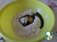 В чашку просеиваем муку, добавляем щепотку соли, разрыхлитель теста, сахар и охлажденное сливочное масло. Перетираем в крошку. |