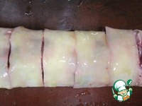 Скрутить в рулет, нарезать на прямоугольники (не прорезая до конца), смазать сливочным масло и выпекать в течении 20-25 минут при t 190-200 С |