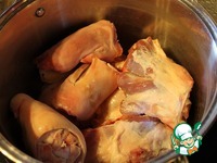 Все мясо промыть, ножки поскоблить, если нужно и сложить все в кастрюлю. Залить водой, как только закипит, варить 1 час снимая пену. |