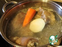 Бульон процедить через сито и 5 слоев марли. Довести до кипения, добавить соль и выключить огонь. |