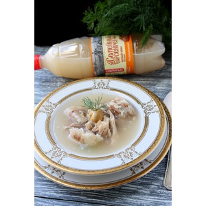 Застывший холодец выложить в тарелку, размять его немного вилкой, добавить квас по вкусу и горчицу. Подавать сразу же. Приятного аппетита! |