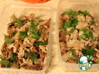 Мясо разобрать руками на волокна, добавить в каждый контейнер чеснок натертый на мелкой терке и зелень. |