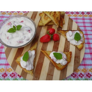 Творог смешиваем с сахарной пудрой и клубникой. Подаем теплые гренки с творожно-клубничным кремом. |