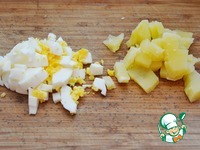 Картофель сварите в мундире, яйца отварите вкрутую, остудите их и нарежьте кубиками. |