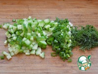Также кубиками нарежьте свежий огурец, нарубите зеленый лук и укроп. |