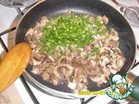 Начинка: грибы нарезать ТОНКО и мелко, потушить под крышкой в масле. Затем нарезать мелко зеленый лук, обжарить слегка. |