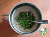 Вмешиваем муку по ложке. Тесто не совсем густое. Добавляем масло подсолнечное. Лук мелко рубим и выкладываем в тесто. Перемешиваем. |