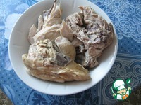 Отварить курицу, у меня была целая курица. Но для блюда взяла только грудку. Разделить грудку на волокна. |