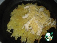 Переворачиваем. На половинку блина кладем курицу и посыпаем сыром. |