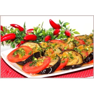 Выкладывать баклажаны на блюдо, чередуя с помидорами. Полить сверху оставшимся соусом. Перед подачей на стол дать настояться и подавать. Приятного аппетита!!! |
