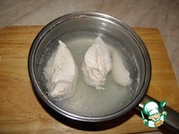 Куриное филе отварить в подсоленой воде в течении 20 минут, снять с огня, и оставить в бульоне до полного остывания. |