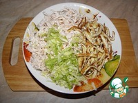 Описание: Друзья дорогие, ведь как это вкусно! Салаты со свежей хрустящей капустой! Конечно в меню нам без них никуда! Своей быстротой выручают всегда! Один рецепт совсем простой, а вдруг оцените с семьей! Капуста и курочка, блинчик яичный, так нежно и вкусно! Салатик отличный!