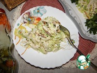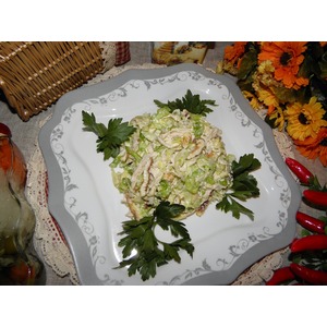 Соединить капусту с курицей и блинчиками, заправить майонезом. |