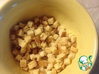 Итак, для начала ломтики батона нарезаем мелкими кубиками и поджариваем в духовке до румяного цвета. Я это делала на 150 градусах. |
