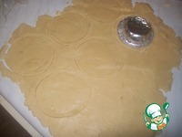 Достаем из холодильника застывшее песочное тесто и раскатываем его толщиной примерно один-полтора миллиметра. Вырезаем круги, диаметром чуть больше наших форм в которых будем выпекать лукошки. |