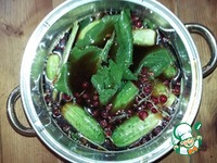 У огурцов отрезаем "попки", перегружаем в ёмкость где будут солиться огурчики всю зеленку, чеснок, ну если хотите ещё ваши любимые приправы,. Пересыпаем красной смородиной. |