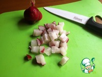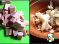 Для красной окрошки ветчину нарезать кубиками. Для белой окрошки охлаждённую отварную рыбу разобрать от костей. |