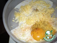 Смешиваем молоко, яйцо, тертый сыр, перец, раздавленный чеснок. |