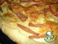 Замесить тесто, растянуть до толщины примерно 7мм, намазать майонезом, посыпать сыром. Порезать колбаску полосками, помидоры тонкими кружочками, лук кольцами. Выложить это все на пиццу. |