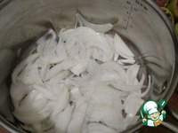 Лук очистить и нарезать перьями. На дно кастрюли налить растительное масло и равномерно распределить лук. |
