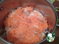 Морковь натереть на крупной терке и равномерно распределить поверх лука. Посолить и поперчить по вкусу. |