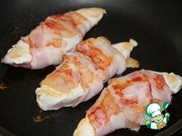 Филе зачистить от пленок и каждое разрезать пополам вдоль на 2 части. Посолить и поперчить. Завернуть каждое филе в бекон ( в одну или две полоски на каждое филе) |