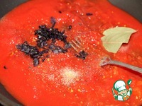 Для соуса в сковороде аккуратно размять вилкой томаты в собственном соку, чтобы кусочки помидоров остались. |