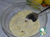 Творог протереть через сито, добавить желток, сахар, манку, изюм, ванилин и взбитый в крутую пену белок. |
