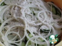 В емкость сложить огурцы и лук, пересыпать солью, перемешать, накрыть тарелкой, поставить груз и оставить на 3 часа. |