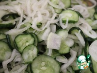 Огурцы вымыть, отрезать кончики и нашинковать толщиной 5 мм. Лук порезать тонкими кольцами. |