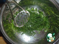 Лук и укроп мелко порезала, посолила и помяла "толкушкой". |