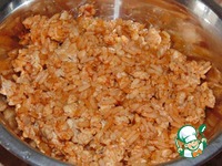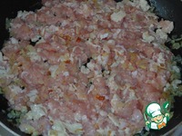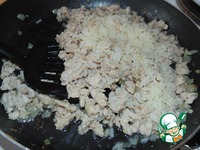 Когда лук подрумянится, добавить фарш, соль, перец и специи. |