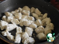 Куриное филе нарезать крупными кусочками и обжарить на растительном масле до золотистого цвета. |