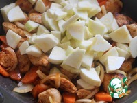 К обжаренной курочке добавить паприку, обжарить 20-30 сек и выложить лук и морковь, тушить 5 минут. |