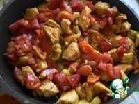 Помидоры ошпарить кипятком, снять шкурку и мелко нарезать. Выложить помидоры к курице с овощами, посолить, тушить до готовности, примерно, еще 15 минут. |