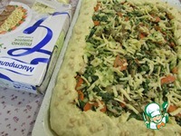 Противень или форму для выпечки смазать сливочным маслом и присыпать мукой. Стряхнуть лишнюю муку. Руки смазать растительным маслом. Уложить тесто на противень, формируя небольшие бортики. |