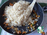 Тем временем сварился рис. Высыпаем рис из пакетов в сковороду и обжариваем вместе с овощами пару минут. |