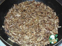 Репчатый лук мелко порезать и обжарить на растительном масле. Шампиньоны нарезать соломкой и обжарить вместе с луком 5-7 минут. |