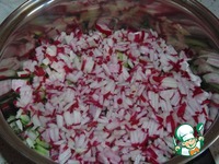 Огурцы и редиску нарезать брусочками, добавить их к зелени. |