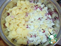 Яйца и картошку нарезать соломкой, отправить к овощам. |