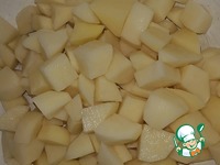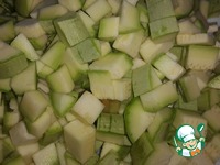 Параллельно крупно режем баклажаны, очищенные от кожуры. |