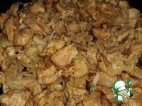 Куриное филе режем крупно и обжариваем на разогретой сковородке. Минут через 10 добавляем соевый соус, карри, соль, лук нарезанный полукольцами. Обжариваем до золотистого цвета. |