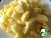 Картофель также порезать кубиком и добавить к печёночно-овощной зажарке. Добавить стакан бульона или воды и тушить под крышкой до готовности картофеля - примерно 12-15 минут. |