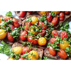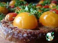 На готовые ломтики хлеба выкладываются помидоры и измельченная петрушка. |
